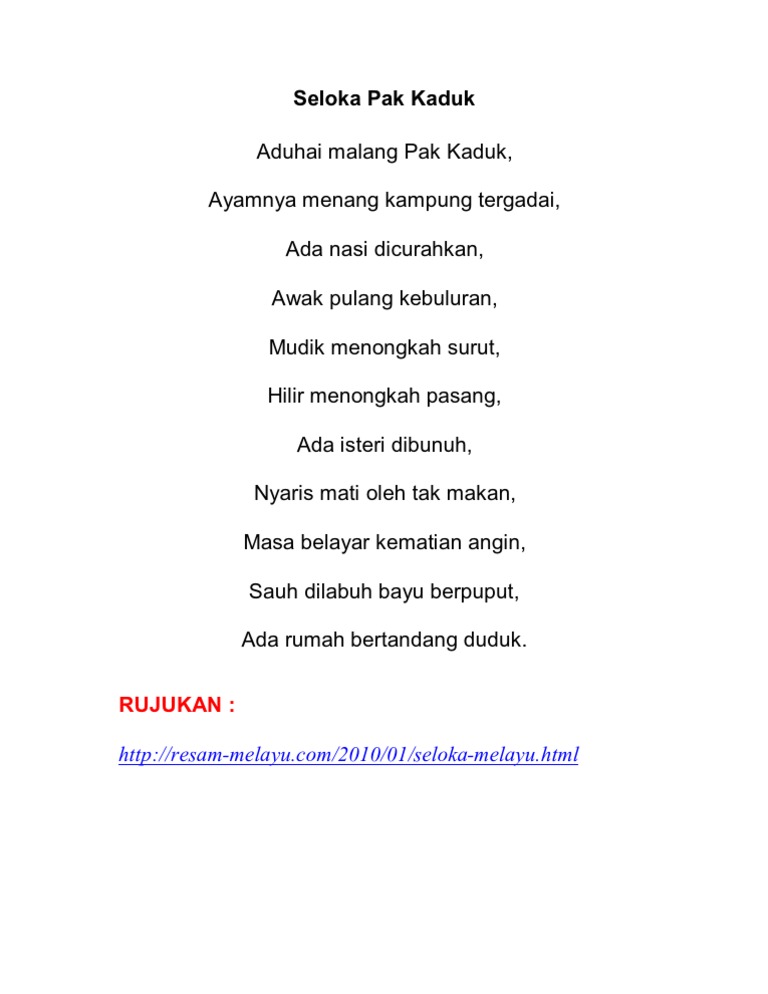 Seloka Pak Kaduk oleh Roslan Madun. Up to 24 cash back Apabila Pak Kaduk mudik dia menongkah surut. Seloka Pak Kaduk Pak Kaduk is a waste of time and is not thrifty.